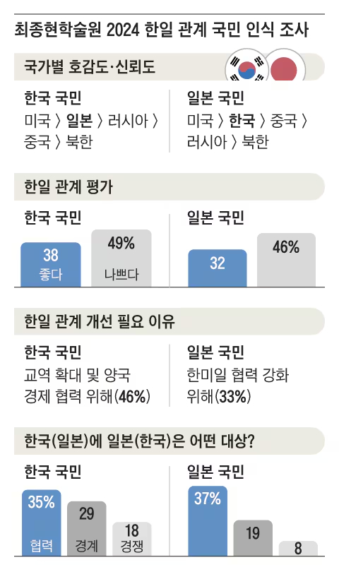 내년 한일 수교 60주년을 맞아 재단법인 최종현학술원이 한국리서치에 의뢰해 지난달 6~10일 양국 성인 2000명을 조사한 결과, 한국 국민의 국가별 호감도·신뢰도는 미국-일본-러시아-중국-북한순이었다. 일본 국민은 미국-한국-중국-러시아-북한순이었다. 양국 국민 모두 미국 다음으로 상대국을 선호하는 것으로 나타났다.