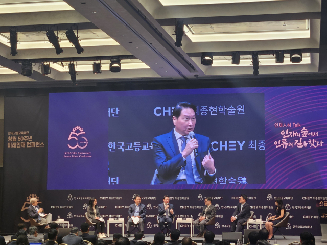최태원 SK그룹 회장이 26일 한국고등교육재단 창립 50주년을 맞아 개최한 ‘미래인재 컨퍼런스’에서 인공지능(AI) 시대가 도래한 만큼 ‘문제가 무엇인지 정의’하고 이를 바탕으로 해결 방법론을 찾는 ‘디자인 능력’을 강조했다.