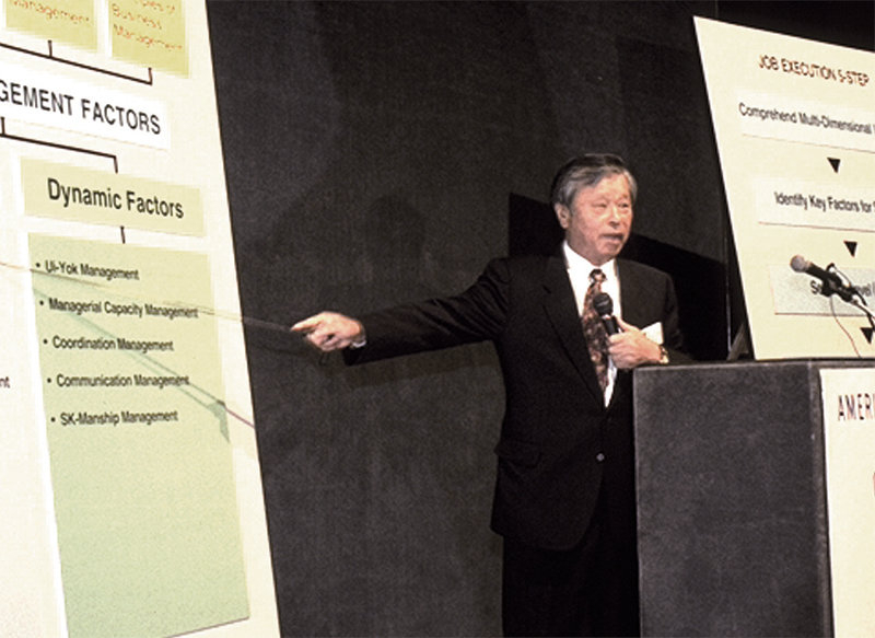 최종현 선대회장은 전국경제인연합회 회장이던 1995년 주한미국상공회의소(AMCHAM) 제너럴 미팅에 참석해 SKMS와 수펙스 추구 등에 대해 강연했다. SK그룹 제공