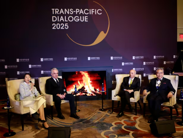 21일 미국 워싱턴 DC에서 열린 최종현학술원 주최 '트랜스퍼시픽 다이얼로그' 좌담회에 커트 캠벨 전 국무부 부장관(왼쪽에서 두번째), 박진 전 외교부 장관(맨 오른쪽)이 참석해있다. /워싱턴특파원단