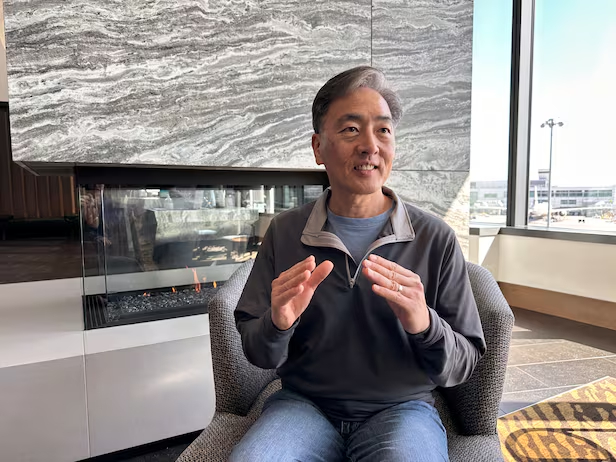 지난 8일 미국 샌프란시스코공항 그랜드 하얏트 호텔 로비에서 만난 김정상 듀크대 교수가 양자컴퓨터와 고전 컴퓨터의 차이를 설명하고 있다./오로라 특파원