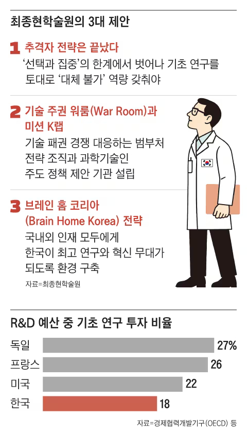 석학들은 모든 혁신의 토대가 되는 기초과학에 투자해야 앞으로 다양한 분야에서 대체 불가능한 혁신을 이룰 수 있다고 주장했다. 하지만 우리나라 기초 연구 투자 비율은 전체 R&D 예산의 18%로 독일(27%), 프랑스(26%), 미국(22%) 등 주요 선진국에 비해 낮은 수준이다. 염한웅 교수는 “AI, 바이오, 반도체 등에서 세계 최고가 되려면 수학·물리·화학·생물학 등 기초과학과 원천 기술의 튼튼한 기반이 필수”라고 했다.