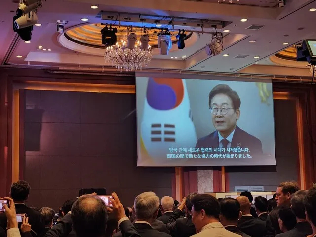 16일 서울 롯데호텔에서 열린 주한일본대사관 주최 한-일 국교정상화 60주년 리셉션에서 이재명 대통령의 영상축사가 상영되고 있다.