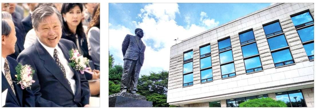 1995년 선경도서관 개관식에 참석한 최종현 SK그룹 선대회장. 오른쪽은 경기 수원 선경도서관 잔디밭에 서있는 최종건 SK그룹 창업회장 동상. /SK그룹 제공