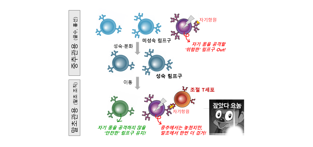 면역관용이란 면역계가 정상적인 자기 몸에게 ‘관용을 베푸는’ 현상입니다. 물론 적절한 수준이 중요하죠. 관용이 너무 약하면, 자기 세포나 조직을 침입자 다루듯 공격하기 때문에, 류마티스 관절염, 제1형 당뇨병, 루푸스 같은 자가면역질환(autoimmune disease)에 걸릴 수 있습니다. 반대로 관용이 지나칠 경우, 면역계가 죽어 마땅한 암세포를 잘 제거하지 못할 가능성이 생깁니다. 굳이 ‘말초’ 관용이라 표현한 것을 보면, ‘중추(central)’ 관용도 있을 것 같죠? 맞습니다. 면역계에서 ‘중추’란 림프구의 생성과 분화, 성숙을 담당하는 장소, 골수(bone marrow)와 흉선(thymus)을 말합니다. B세포*와 T세포*는 모두 골수 출신이지만, B세포는 골수에서, T세포는 흉선에서 각각 성숙 단계를 거칩니다. 이 때 면역계가 중추관용을 획득합니다. *B세포: 항체를 생성해 병원체를 제거하는 항체 매개 면역을 담당하는 림프구 *T세포: 감염된 세포를 직접 파괴하거나 면역 반응을 조절하는 세포 매개 면역을 담당하는 림프구