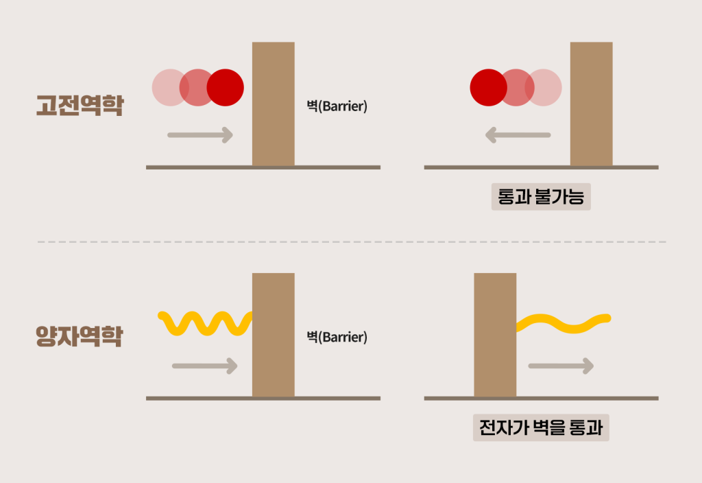 터널링이 불가능한 고전역학 세계(위) vs 가능한 양자역학 세계(아래) SK하이닉스 뉴스룸 |