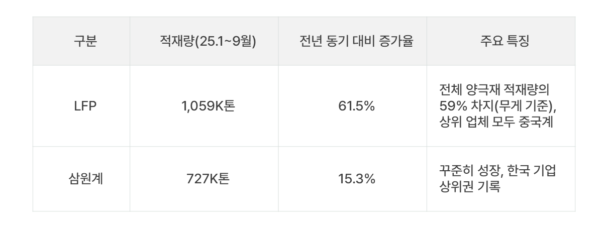 가속화되는 중국 의존도: LFP 급성장과 공급망 무기화 위협 배터리는 크게 양극재*, 음극재, 전해질, 분리막 네 가지 핵심 구성물로 이루어져 있습니다. 이 중에서도 양극재는 배터리 셀 비용의 절반을 차지하는 가장 비싼 소재이자, 전기차 주행거리와 성능을 좌우하는 핵심입니다. *양극재: 리튬이온 배터리의 +극 소재로, 배터리의 용량과 출력 성능에 직접적으로 영향을 미치는 핵심 소재 양극재 시장은 삼원계(니켈, 코발트, 망간 기반)와 LFP(리튬, 인, 철, 산소 기반)로 나뉘며, 최근 LFP가 폭발적으로 성장하면서 전체 시장의 주류가 되었어요. 올해 1월~9월 기준, 전 세계 전기차용 양극재 적재량은 1,786K톤(SNE 리서치, 11.11.)으로, 전년 동기 대비 38.8% 증가했습니다. 특히 LFP 양극재는 작년 대비 61.5% 증가한 1,059K톤으로 전체 시장의 약 59%를 차지했답니다. 이 LFP 부문의 상위 업체(Hunan Yuneng, Wanrun, Dynanonic, Lopal)는 모두 중국계라는 사실.. 한편, 삼원계 양극재는 727K톤으로 전년 동기 대비 15.3% 성장했는데, LG화학, 에코프로, 포스코 등 한국 기업이 상위권에 위치하고 있답니다. |